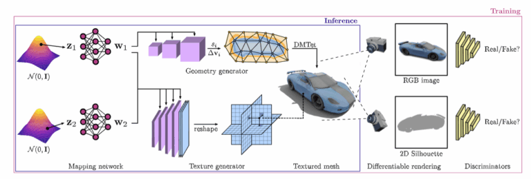 随着多个行业朝着大规模的 3D 虚拟世界发展,能够生成大量的、高质量的、多样的 3D 内容的工具是非常被需要的。英伟达的最新工作 GET3D 希望训练更好的 3D 生成模型,来生成下游任务可以直接使用的、保真纹理和复杂几何细节的 3D 模型。 幻方 AI 最近对这项工作进行了整理和优化,在幻方萤火二号上复现了实验。通过幻方自研的 3FS、hfreduce、算子,对模型训练进行提速,从单机多卡的训练